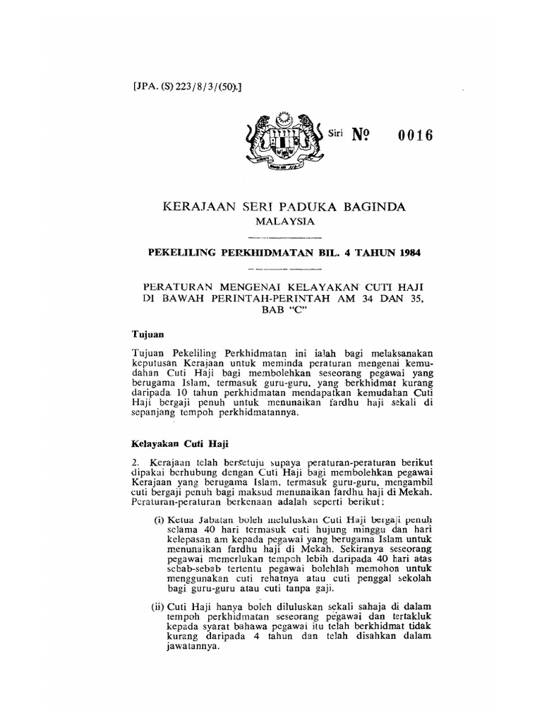 Pekeliling cuti menunaikan haji. Tempoh sebenar menunaikan fardhu haji tidak melebihi 40 hari mengikut pekeliling perkhidmatan bil 4 84. Pekeliling perkhidmatan ini bertujuan untuk melaksanakan keputusan kerajaan bagi kemudahan cuti umrah yang merupakan cuti tanpa rekod untuk pegawai perkhidmatan awam persekutuan yang beragama islam menunaikan ibadah umrah sekali. Bagi pegawai agc ibu pejabat sertakan borang permohonan kemudahan perlindungan. Cuti tanpa gaji bagi pegawai yang mengikuti pasangan mereka bertugas atau berkursus.
