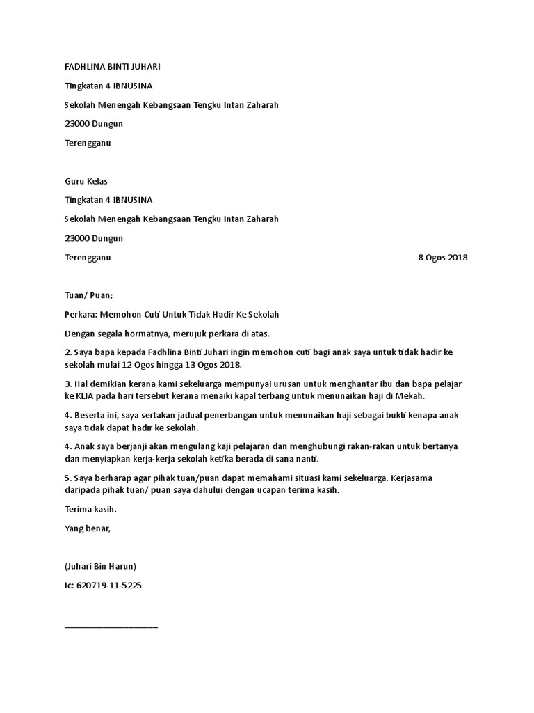 Download 6 Contoh Surat Rasmi Tidak Hadir Sekolah Kuliah Melur Net