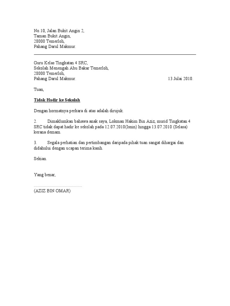 Contoh Surat Tidak Hadir Ke Sekolah Dengan Pelbagai Alasan Yang Munasabah